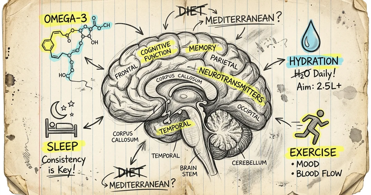 Diets rich in omega-3 fatty acids (fatty fish, walnuts, flaxseed), leafy greens, and whole grains consistently outperform processed-food-heavy diets in cognitive testing. The Mediterranean and MIND diets have the strongest evidence base here.
